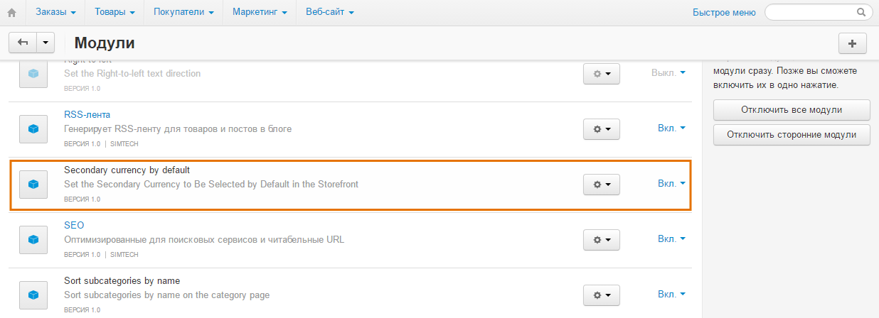 После установки модуль Secondary Currency by Default появится в списке. Нажмите на название модуля.