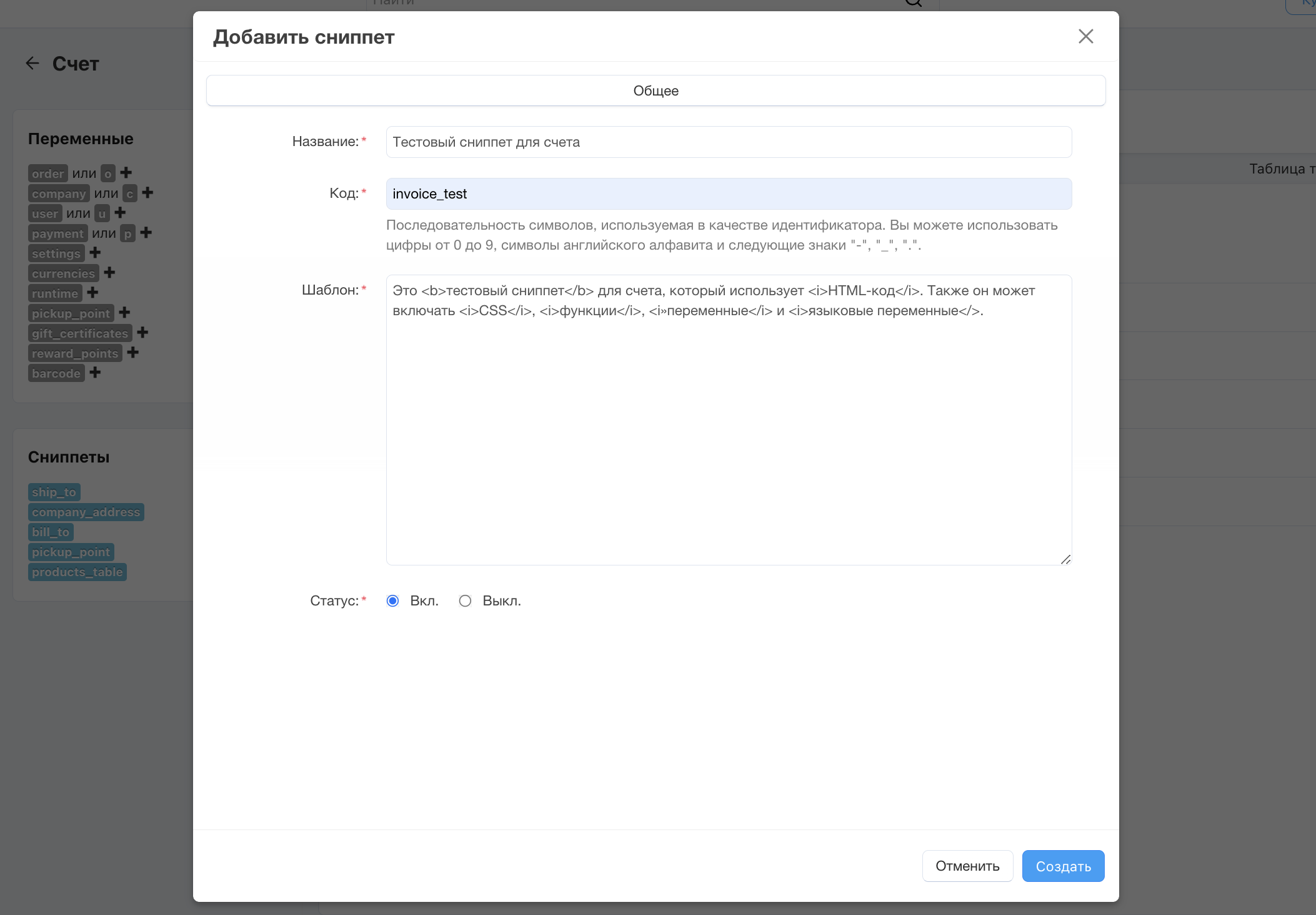 • Статус — сниппеты могут быть Включенными (Вкл.) или Выключенными (Выкл.). Выключенные сниппеты не отображаются среди доступных сниппетов на экране редактирования шаблона и никак не влияют на документы.