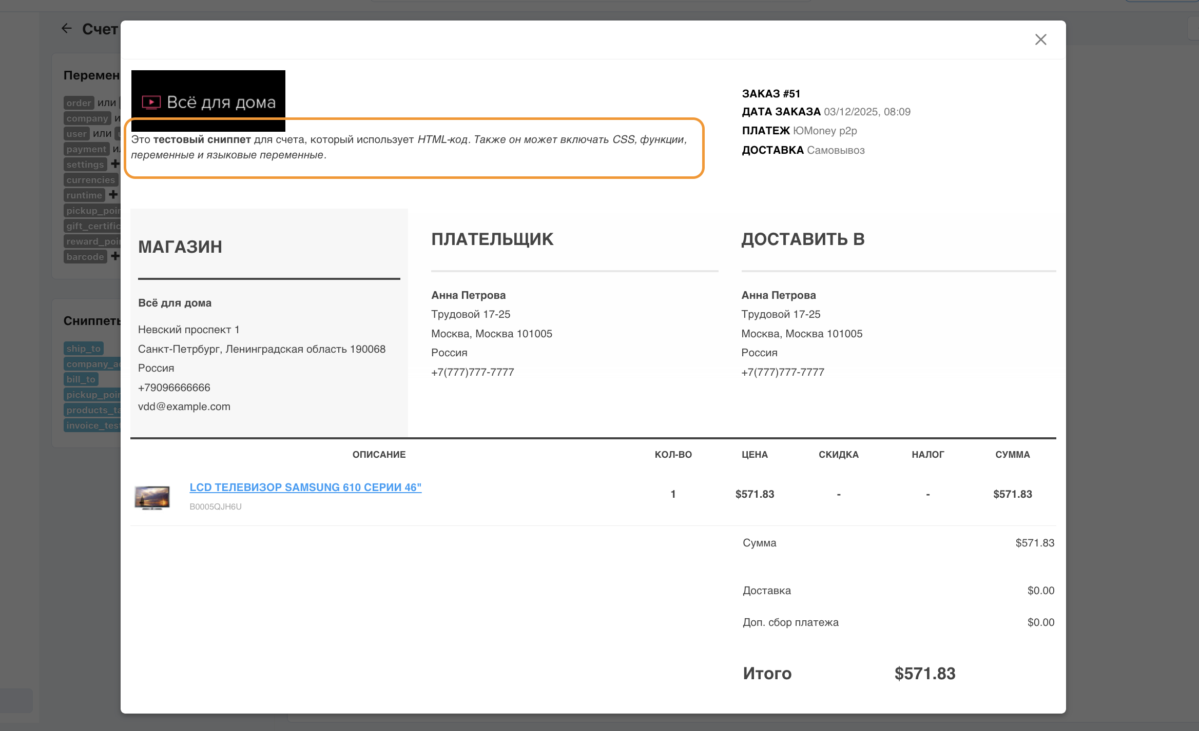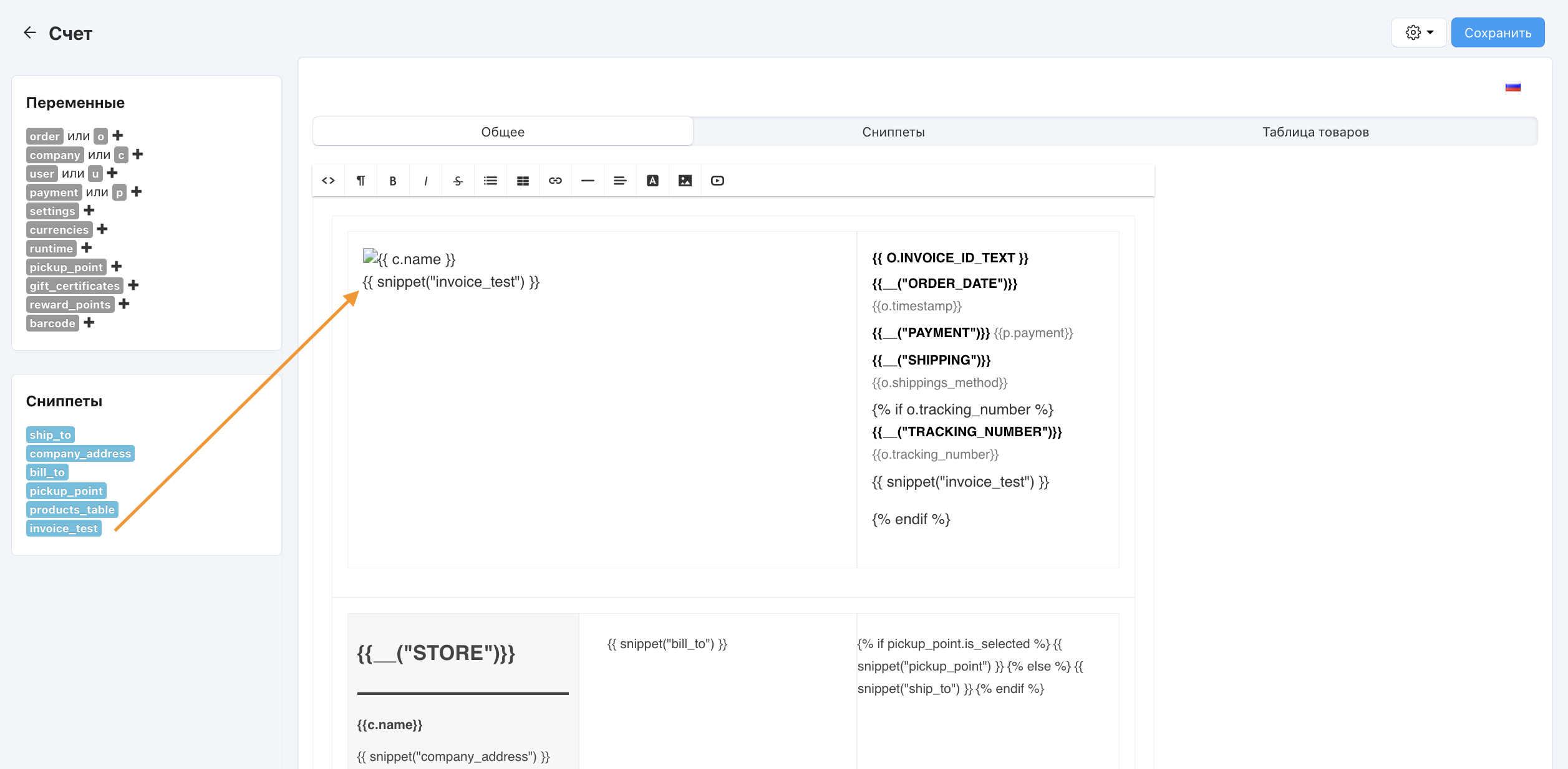 Также вы можете вставлять сниппеты в шаблон вручную. Например, чтобы вставить сниппет с кодом invoice_test, добавьте в шаблон {{ snippet(“invoice_test”) }}. После этого содержимое сниппета будет отображаться в предпросмотре документа.