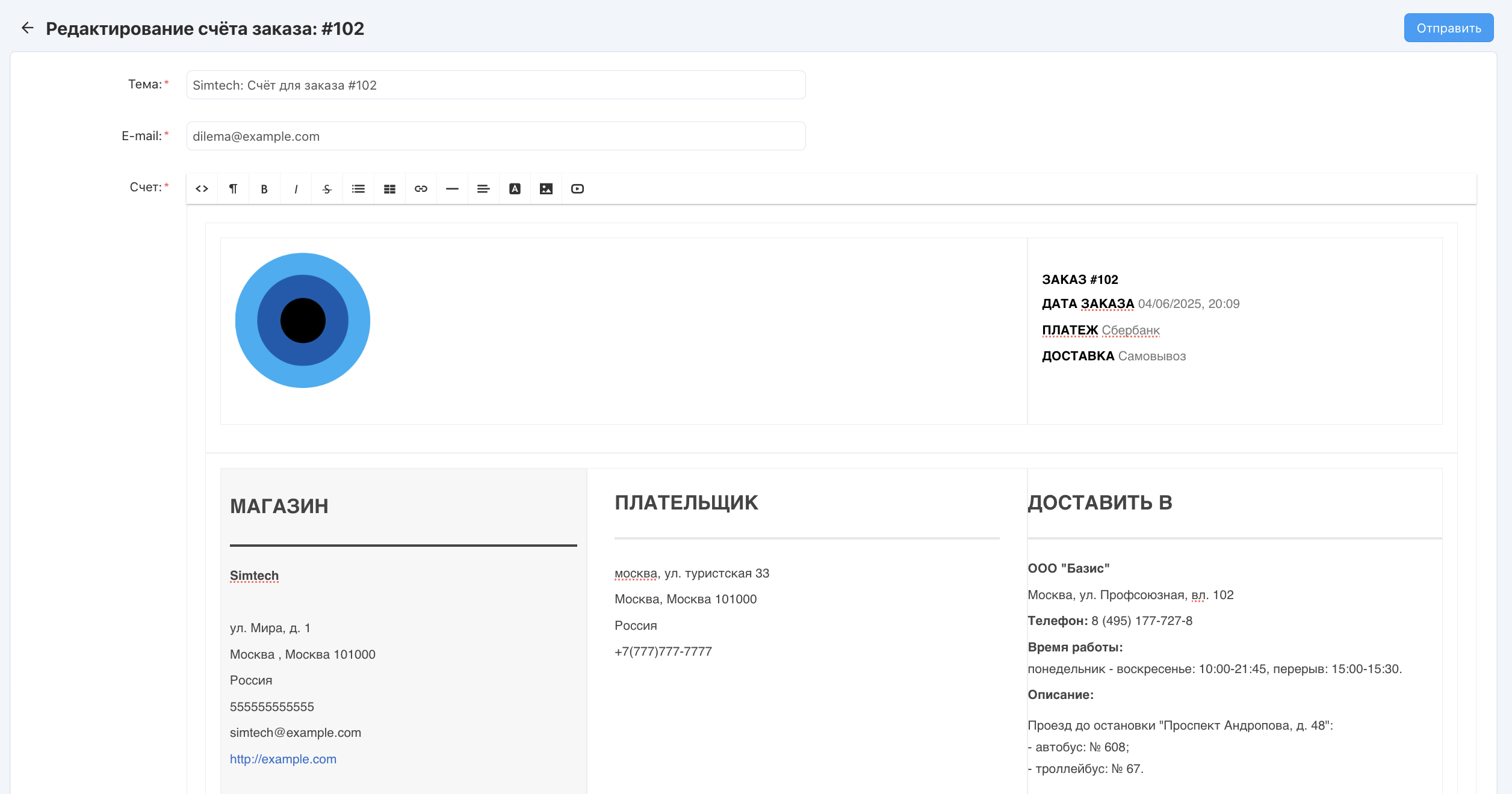 Счёт — счёт, генерируемый из данных заказа. Это тело вашего письма. В этом поле вы можете вносить в счёт любые изменения. Данные изменения не повлияют на данные в вашем магазине.