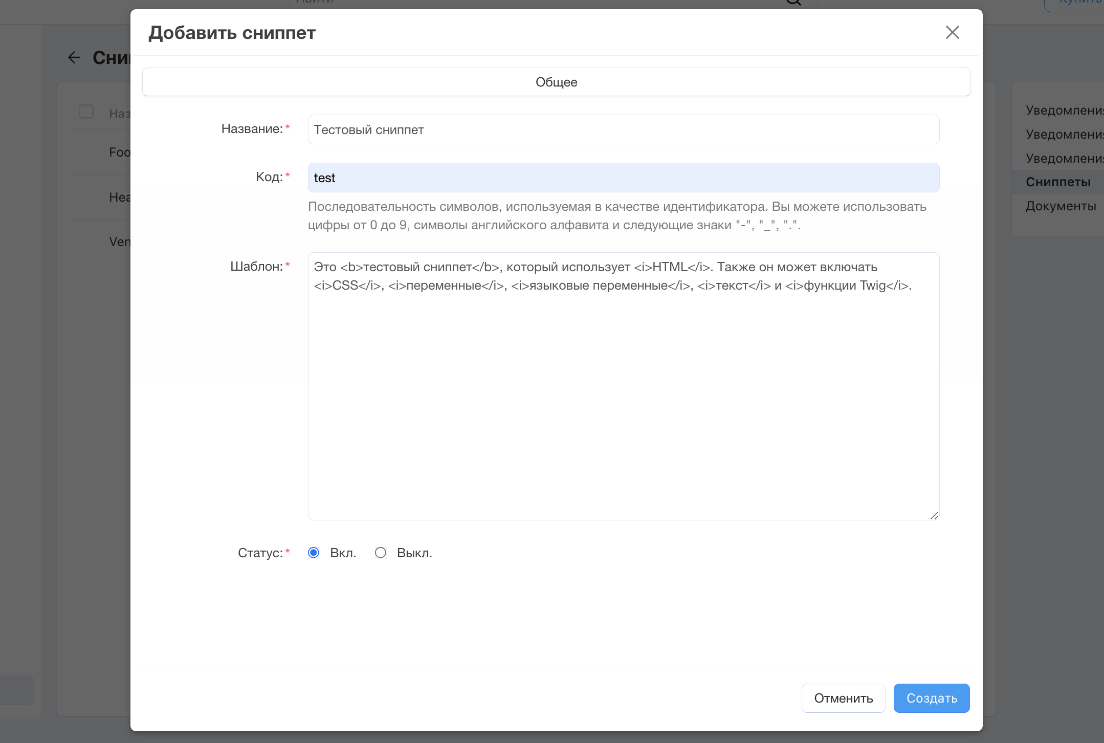 • Шаблон — содержимое сниппета. В этом поле вы можете пользоваться обычным текстом, переменными, языковыми переменными, функциями Twig, а также HTML и CSS-кодом.