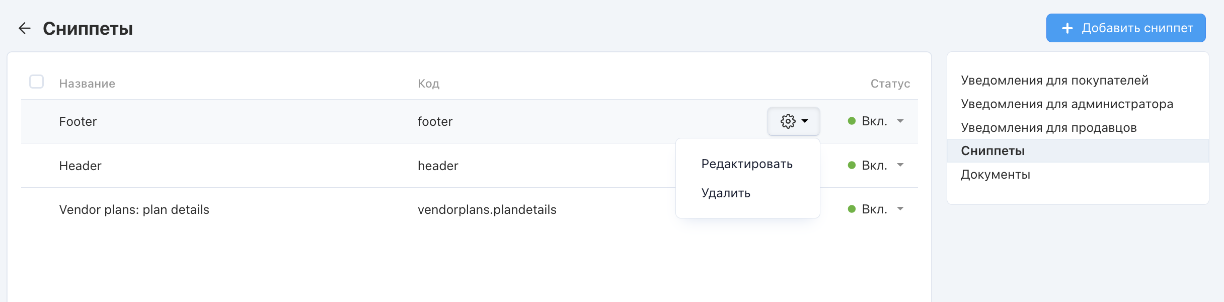 • Для удаления одного сниппета, щёлкните по кнопке с изображением шестерёнки рядом с ним и выберите Удалить.
