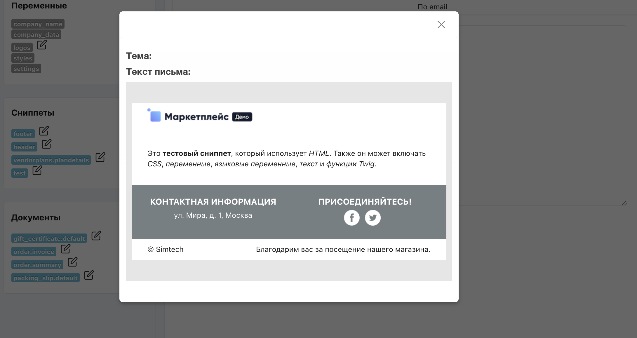 Сниппеты — это готовые элементы шаблонов, используемые в различных email-уведомлениях. Сниппеты используются в двух случаях: