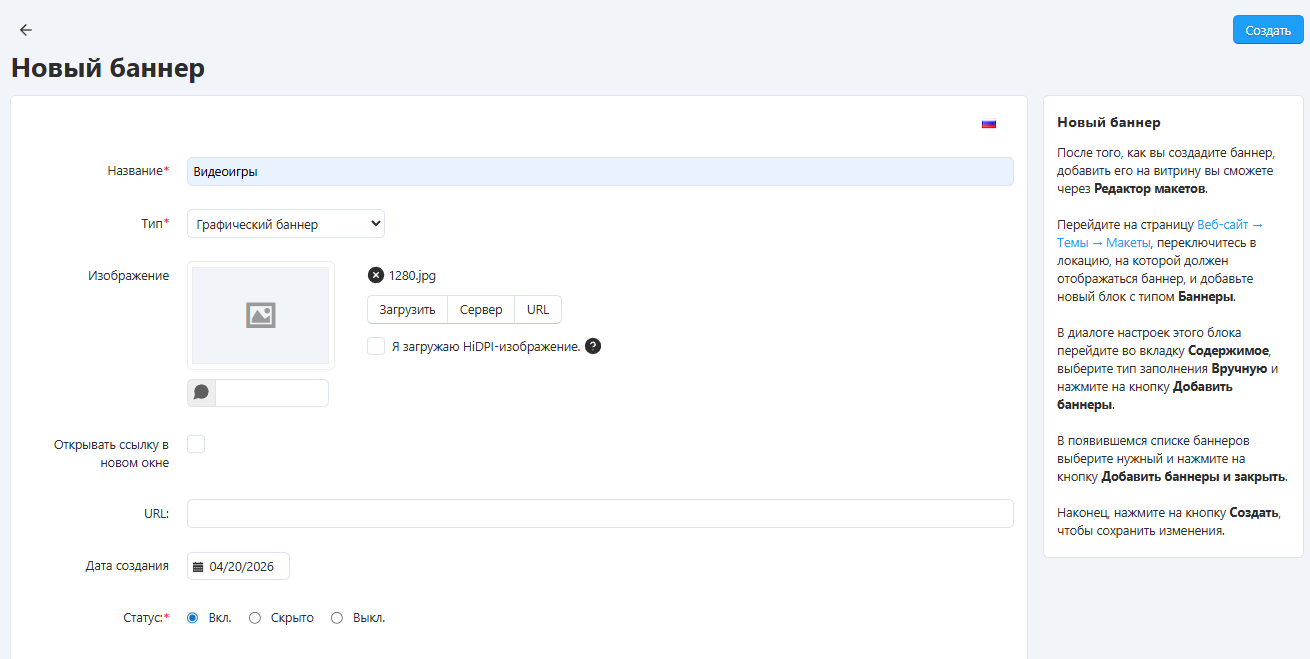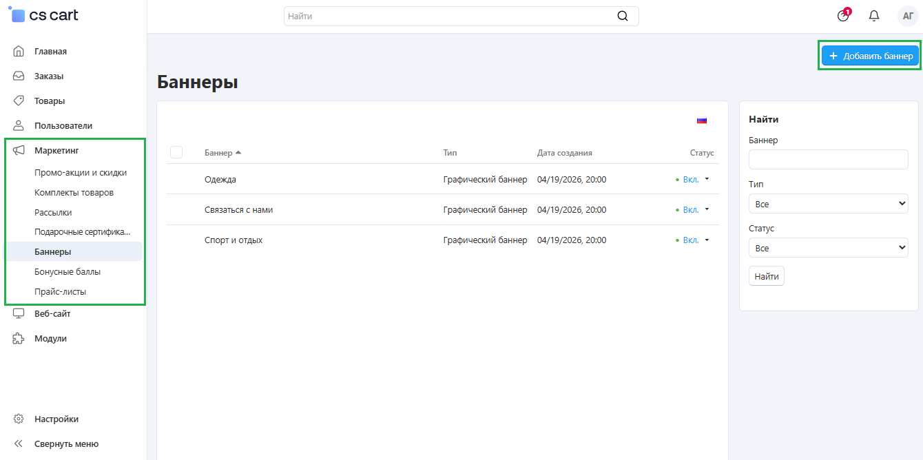 В панели администратора откройте страницу Маркетинг → Баннеры и нажмите кнопку + Добавить баннер в правом верхнем углу и на открывшейся странице: