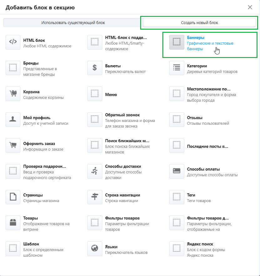 Переключитесь на вкладку Создать новый блок и выберите тип блока Баннеры: