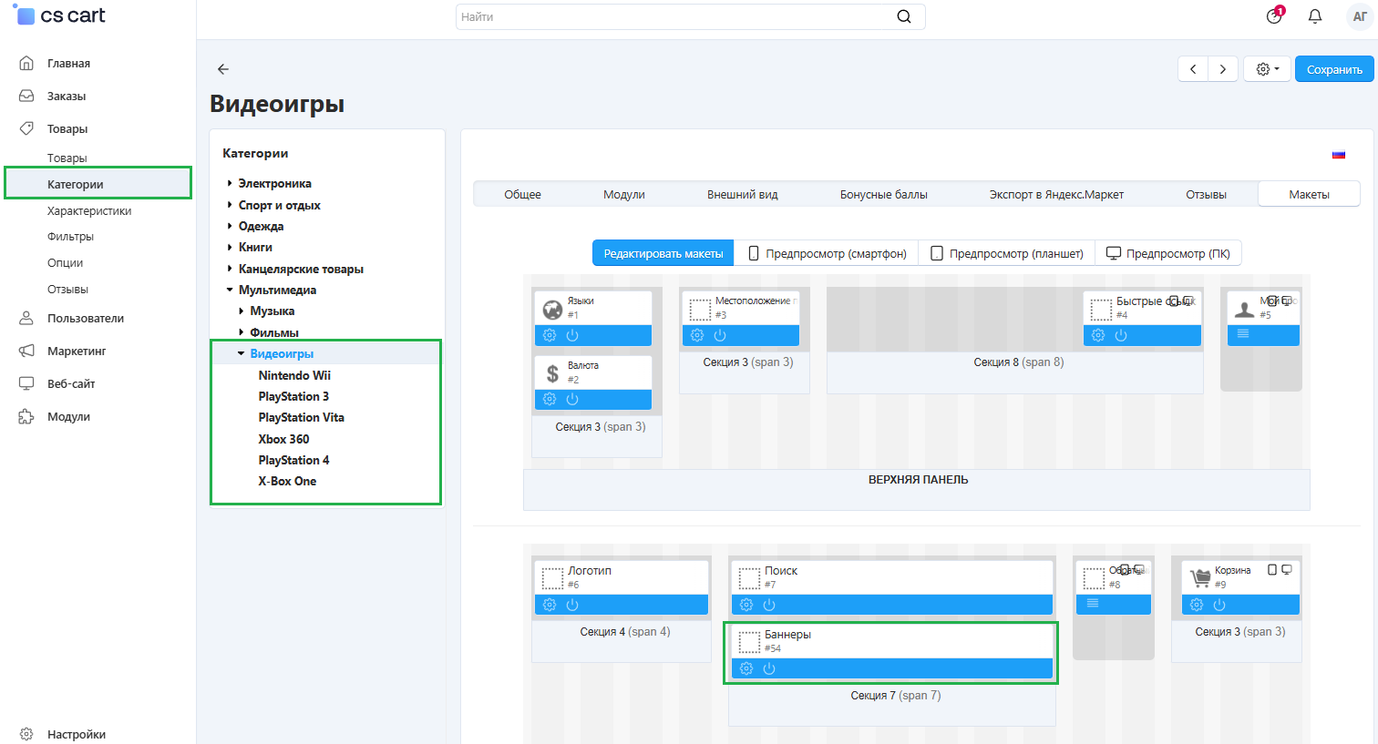 В панели администратора откройте страницу Веб-сайт → Темы → Макеты и переключитесь на вкладку Категории.