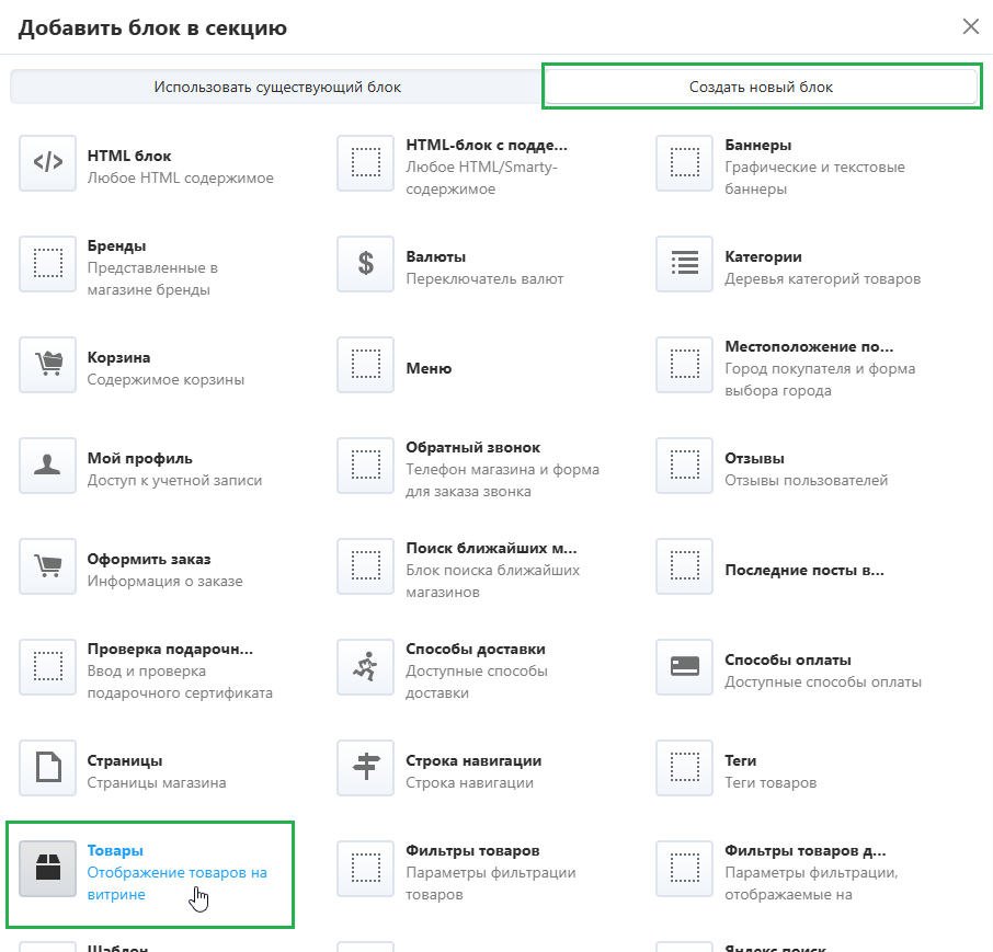 Переключитесь на вкладку Создать новый блок и выберите тип блока Товары: