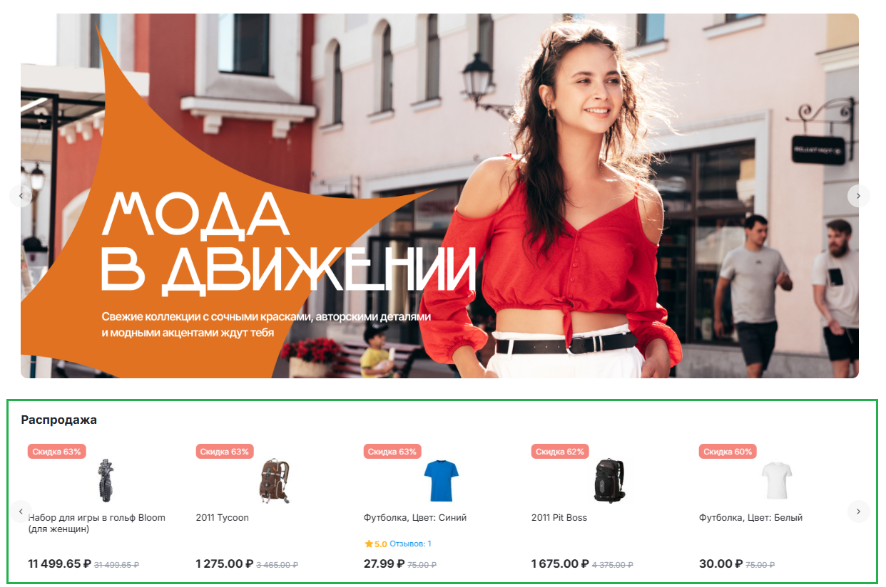 Блок товаров со скидкой, или “Распродажа”, помогает пользователям сразу увидеть товары со скидкой и чаще принимать решение о покупке. Он также повышает интерес к магазину и стимулирует повторные визиты.