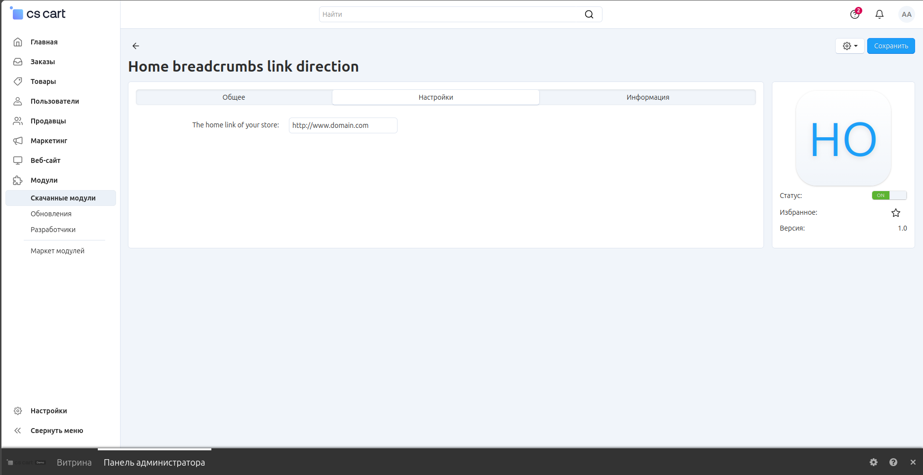 Откроется окно с настройками модуля. В поле The home link of your store укажите, куда должна ссылаться “Главная”. По умолчанию стоит http://www.domain.com: