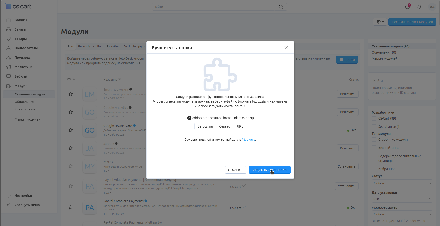 Во всплывающем окне нажмите кнопку Загрузить и выберите архив с модулем.
