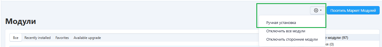 Нажмите кнопку шестеренки и выберите Ручная установка, чтобы установить модуль из архива: