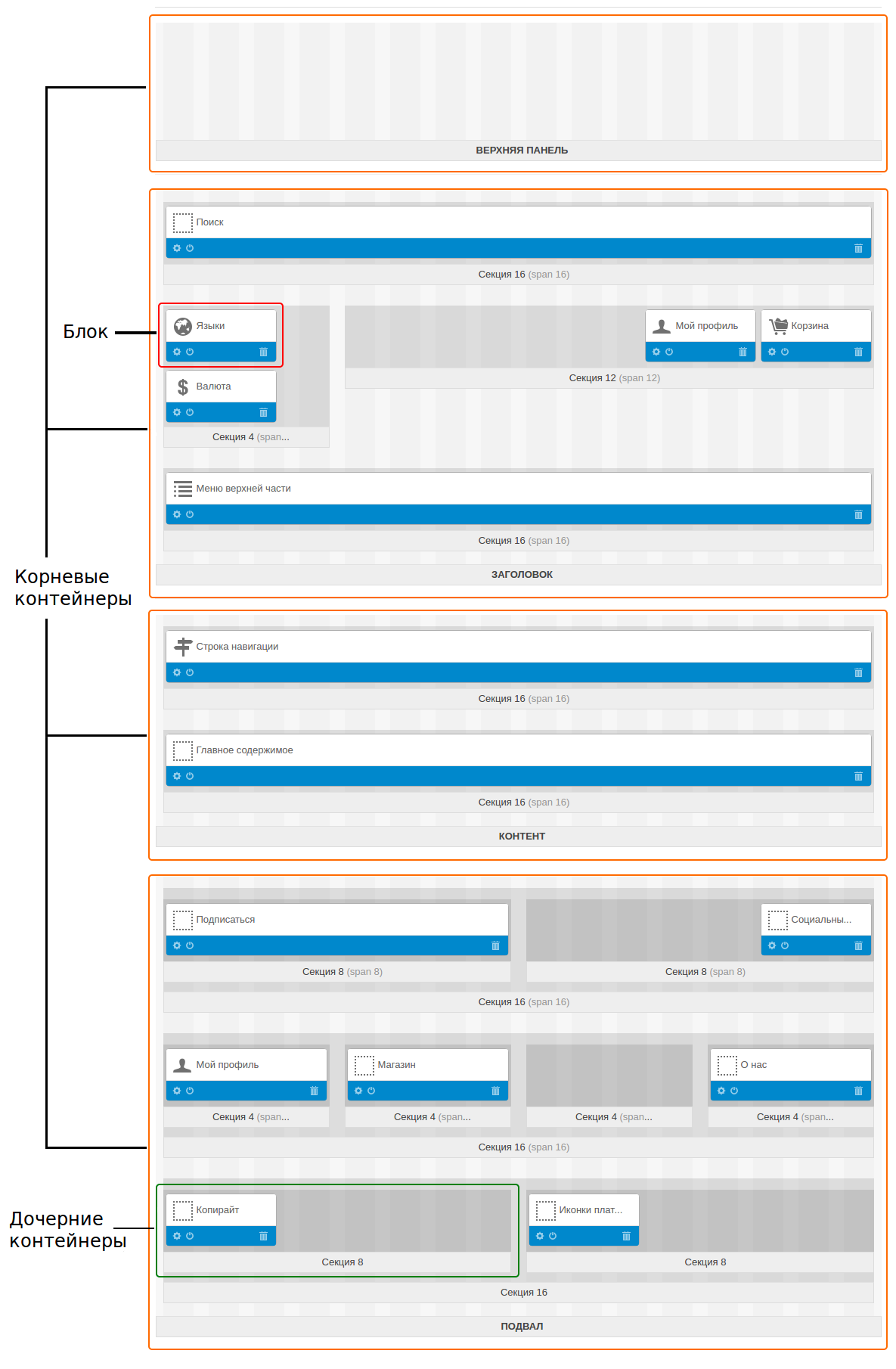 Дочерние контейнеры (секции) позволяют точнее структурировать информацию на витрине и создавать более сложные макеты. Секции можно добавлять в корневые контейнеры или в другие секции, причем у каждой секции может быть свой размер, положение и стиль.