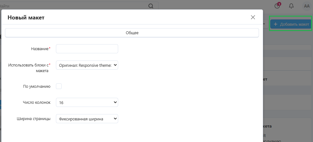Нажмите кнопку + Добавить макет в правом верхнем углу страницы.