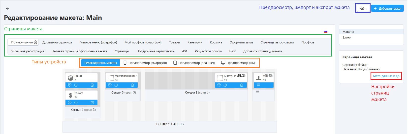 - кнопка шестеренки открывает меню редактирования макета для той страницы макета, на которой вы находились, когда нажали эту кнопку;