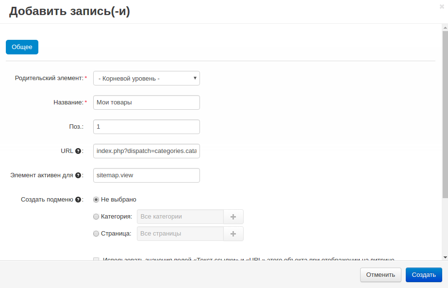 URL — введите URL страницы, которая будет открываться при переходе по ссылке (напрнимер, index.php?dispatch=categories.catalog).