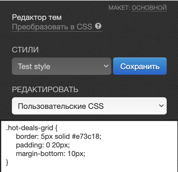 Любые стили, которые вы пишете в разделе Custom CSS, имеют приоритет над стилями по умолчанию, что позволяет вносить удобные изменения без изменения основных файлов. При загрузке страницы правила CSS применяются последовательно; следовательно, правила, определенные в инструменте редактора тем, перезаписывают правила по умолчанию.
