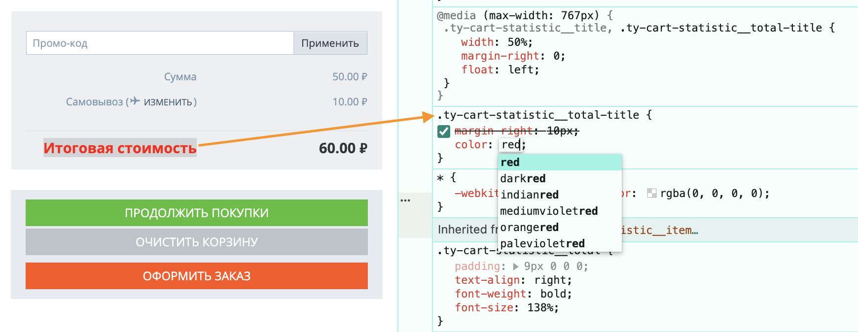 1. Попробуйте: Вы можете изменять свойства CSS непосредственно на панели «Стили». Это позволит вам увидеть, как потенциальные изменения будут выглядеть в реальном времени. После того, как вы будете удовлетворены, скопируйте окончательный CSS в раздел «Пользовательский CSS» в CS-Cart.