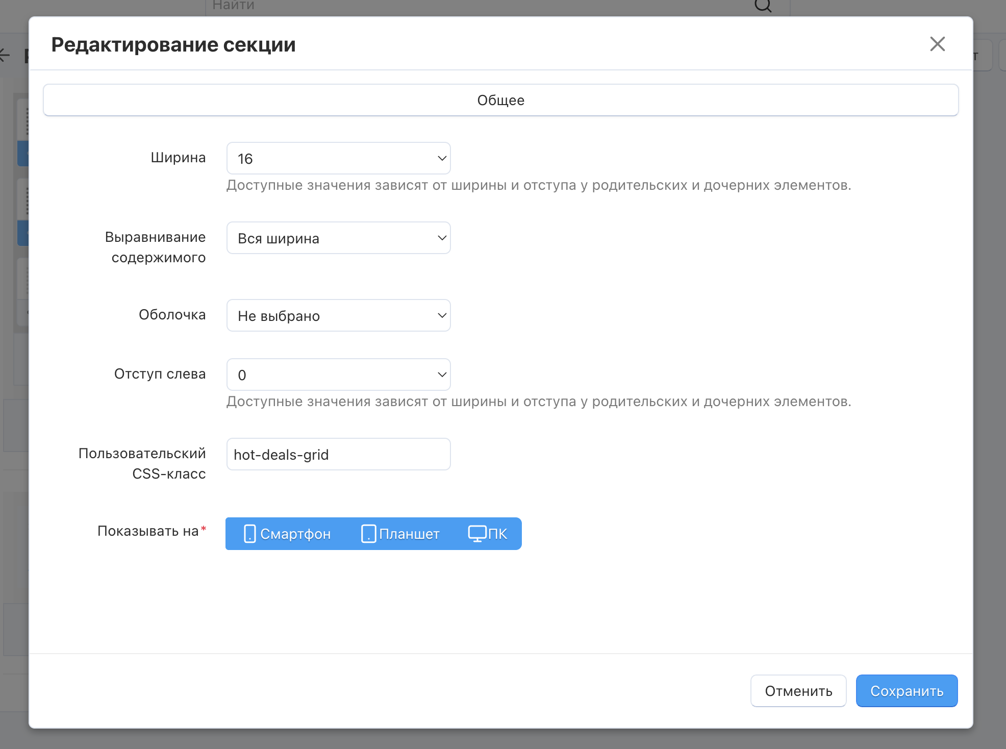 3. Введите имя пользовательского класса в поле Пользовательский класс CSS, например hot-deals-grid, и сохраните изменения;
