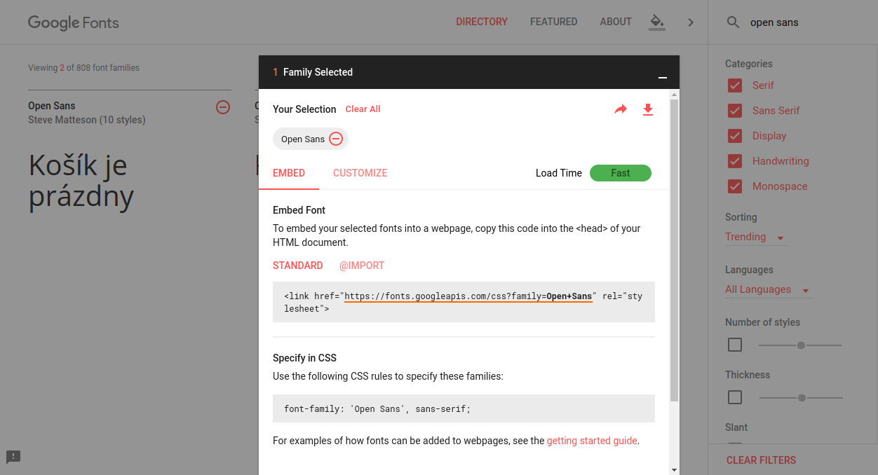 - Go to Google Fonts and choose the desired font. Open Sans, for example.