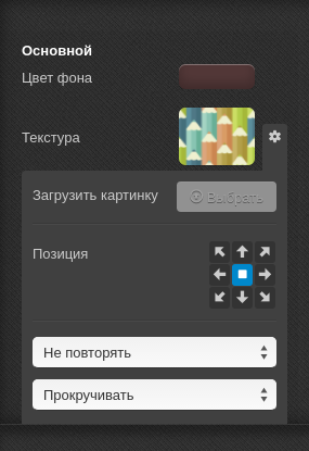 Также с помощью кнопок, расположенных под шестерёнкой, можно задать точное положение изображения на странице, выбрать тип отображения: замостить, повторять по горизонтали и т.д., а также установить прокручивание или фиксированное положение изображения при прокрутке страницы.