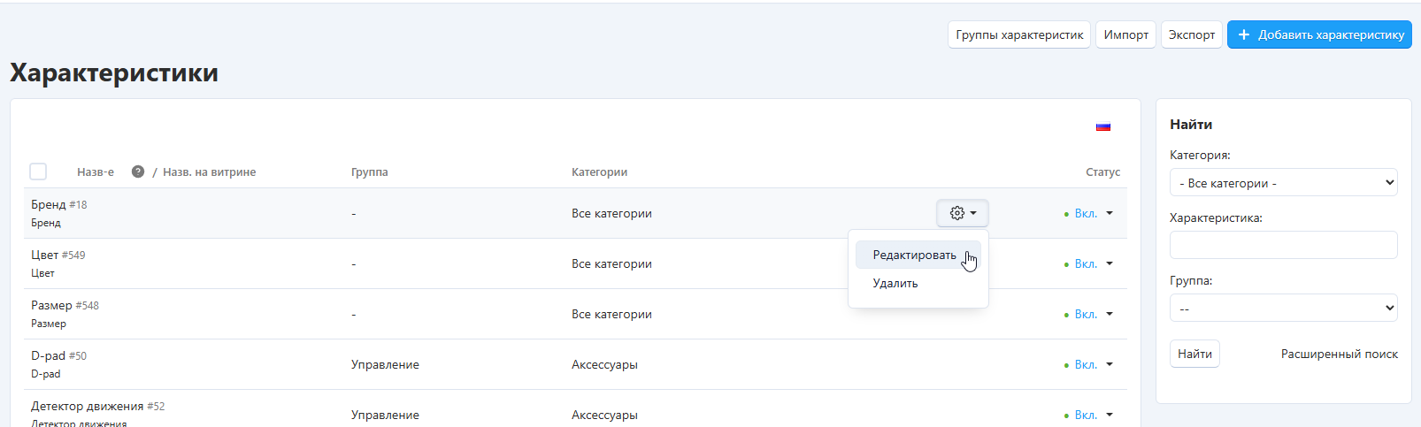 Чтобы отредактировать характеристику, нажмите иконку шестеренки и выберите опцию Редактировать: