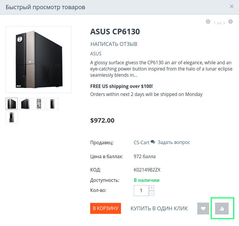 По умолчанию эта галочка уже проставлена. Это означает, что у каждого товара в магазине есть иконка Добавить в список сравнения. Она появится и на страницах товаров, и при во всплывающих окнах при быстром просмотре.