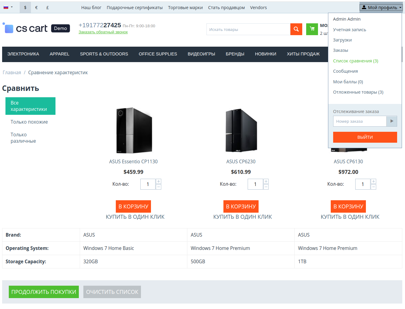 В CS-Cart и Multi-Vendor можно сравнивать характеристики товаров. Покупатели добавляют товары в список сравнения, и характеристики этих товаров отображаются в виде таблицы. В этой статье рассказывается, как включить список сравнения и определить, какие характеристики попадут в список сравнения.