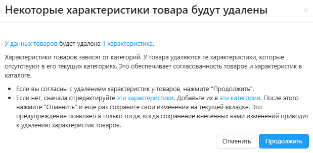 Начиная с версии CS-Cart 4.20.1 система предупреждает о том, что в случае изменения характеристики или категории товара данная характеристика может быть удалена, и предложит дальнейшие действия.