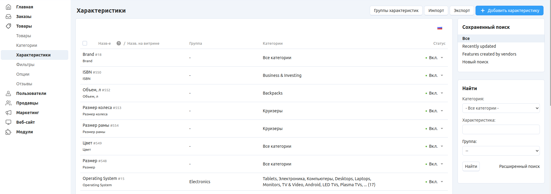 На странице Товары → Характеристики находится список всех характеристик, которые доступны в вашем магазине. Если нужно, вы можете организовать их в группы, а затем редактировать уже свойства всей группы, а не каждой отдельной характеристики.