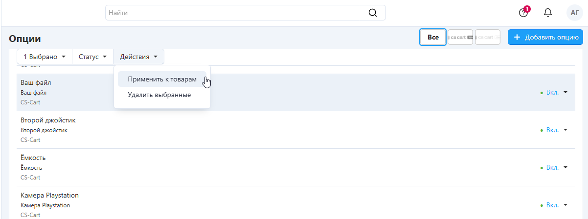Как применить опцию сразу к нескольким товарам¶