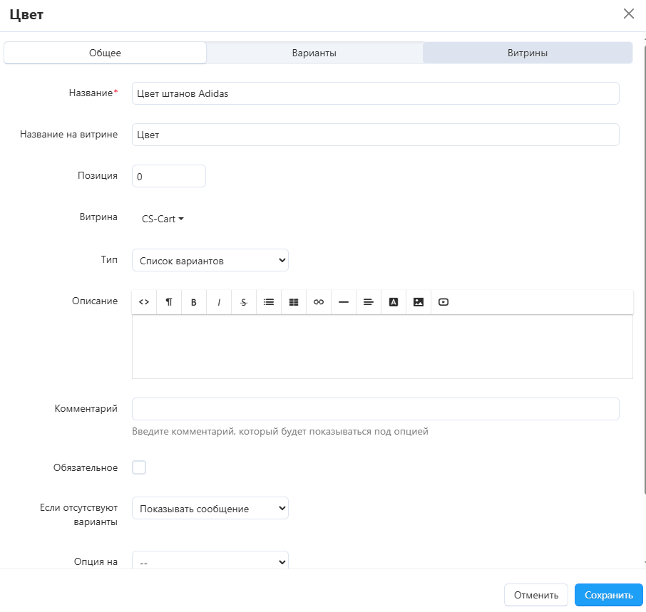 - Витрина (только для CS-Cart) — витрина, которой принадлежит опция.