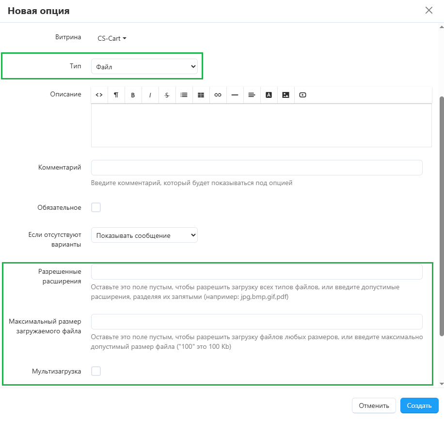 Для опции с типом Файл можно задать следующие дополнительные параметры: