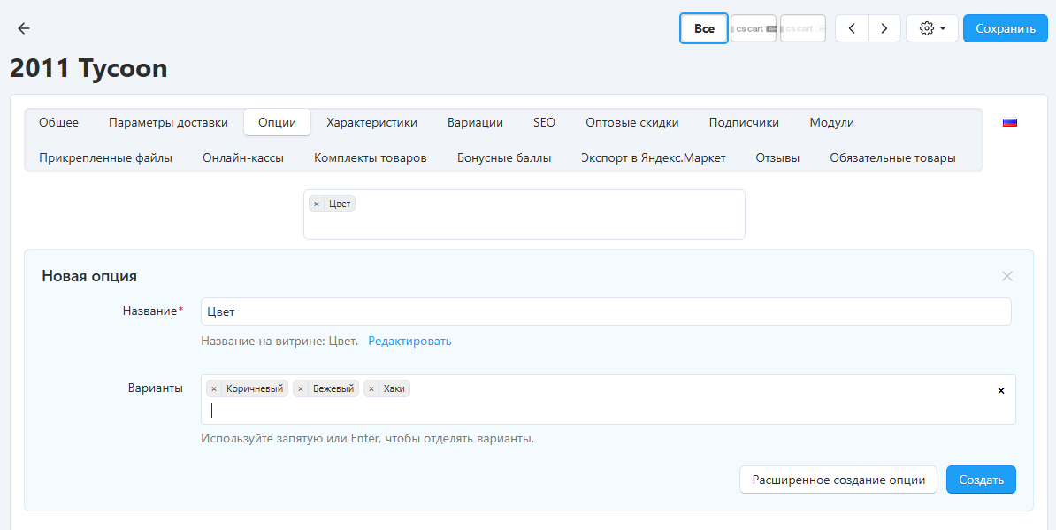 Как создать опцию для товара¶