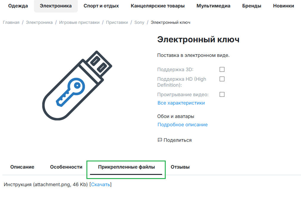Файлы можно прикреплять к товарам, чтобы предоставить покупателям дополнительную информацию. Например, если вы продаёте программы, то можете прикрепить PDF-файл с руководством пользователя. Файл будет доступен для скачивания всем пользователям на странице товара.