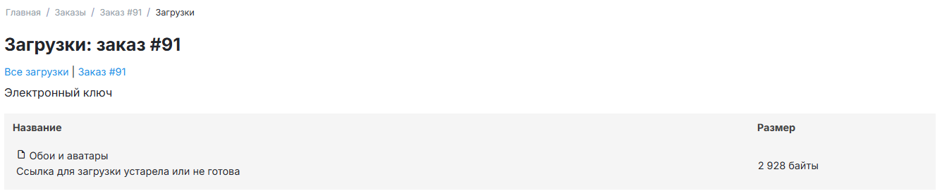 В размещенном заказе будет ссылка на страницу загрузки, содержащая имя файла для загрузки. Когда загрузка будет разрешена или активирована, строка с именем файла будет преобразована в ссылку на загрузку, и покупатель получит эту ссылку по электронной почте.