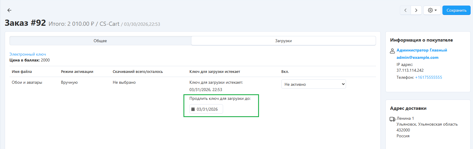 Если период скачивания товара нужно ограничить, перейдите на страницу Настройки → Общие настройки → Каталог и укажите время в часах для настройки Период доступности ключа для скачивания цифровых товаров в часах. Этот период можно продлить для отдельного заказа на странице редактирования заказа: