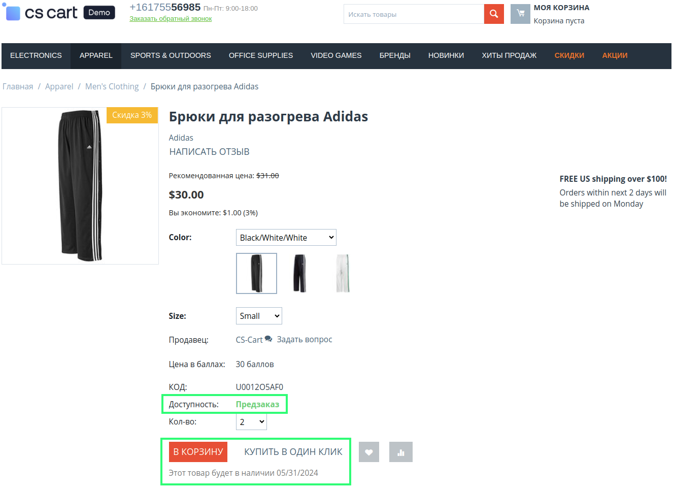 Предзаказ — покупатель сможет купить товар заранее, независимо от того, сколько экземпляров товара сейчас в наличии и указана ли дата доступности товара.