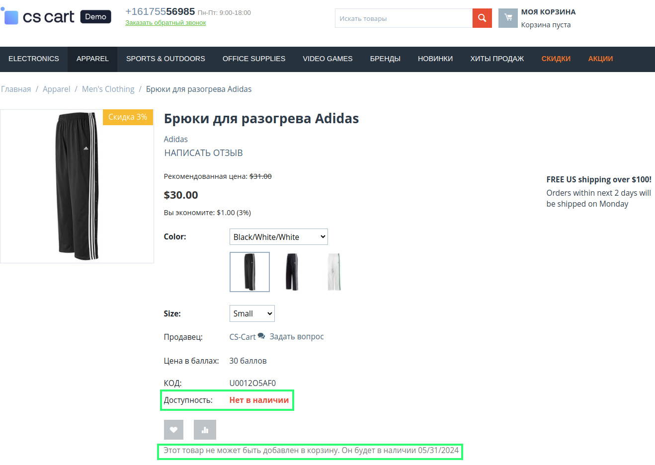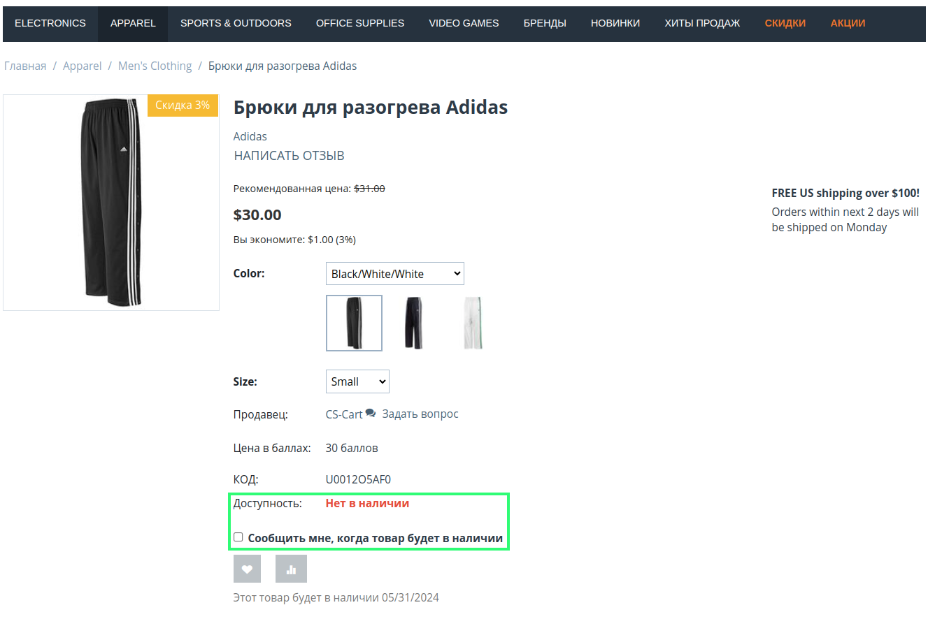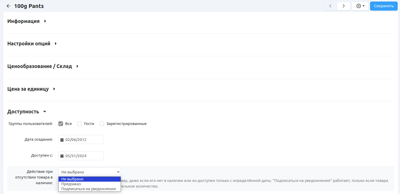 Если товара нет в наличии, то CS-Cart позволяет вам выбрать, какие действия доступны для пользователя на странице товара. Перейдите на страницу Товары → Товары и нажмите на название товара. Откроется страница редактирования, а на ней вы сможете выбрать Действия при отсутствии товара в наличии: