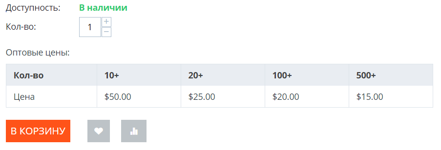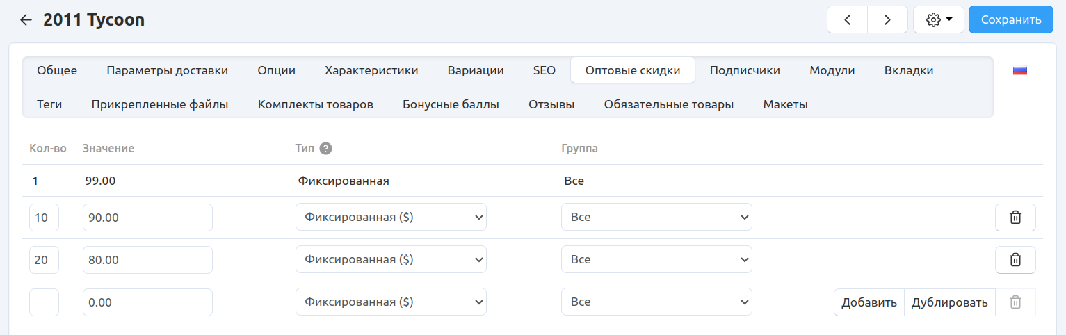 На этой вкладке задаются оптовые скидки на товар в зависимости от количества штук в корзине. Покупатели увидят эти скидки на странице товара на витрине.
