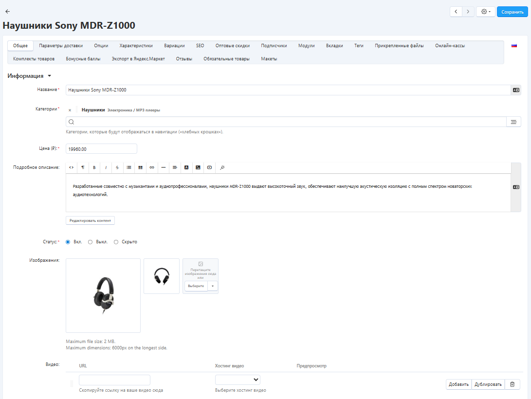 При создании или редактировании товара можно указать много разных свойств. Для удобства они распределены по вкладкам на странице редактирования товара.