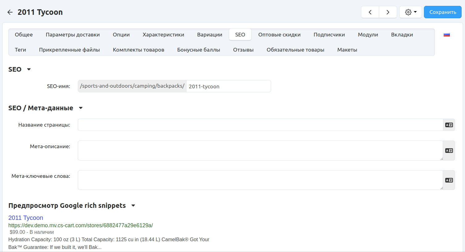 • SEO-имя — значение, на которое изменится стандартный URL страницы. Это поле добавляется модулем SEO.