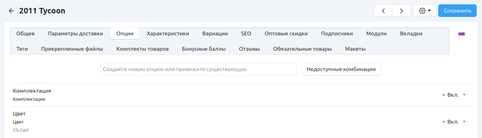 Эта вкладка появляется, если включен модуль “Комбинации товаров”.