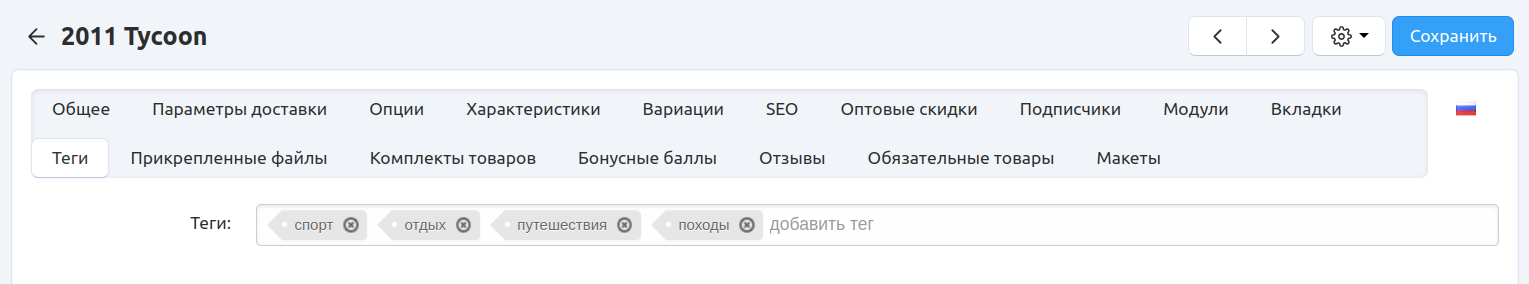 На этой вкладке находится список тегов, связанный с товаром. Теги появляются на витрине в блоке Теги.