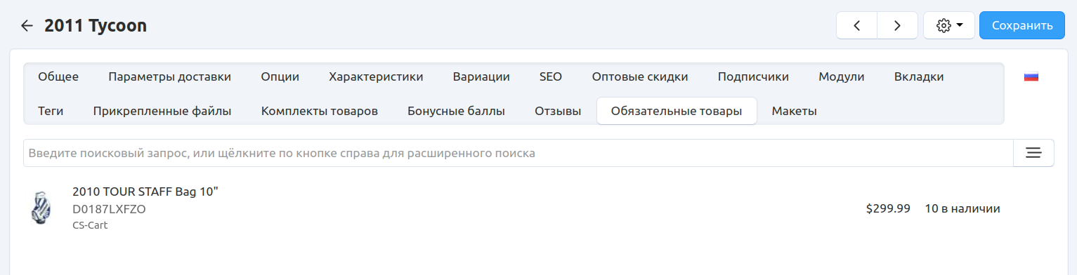 На этой вкладке находится список товаров, которые обязательно будут добавлены в корзину вместе с этим товаром. Нажмите кнопку Добавить товары, чтобы выбрать обязательные товары.