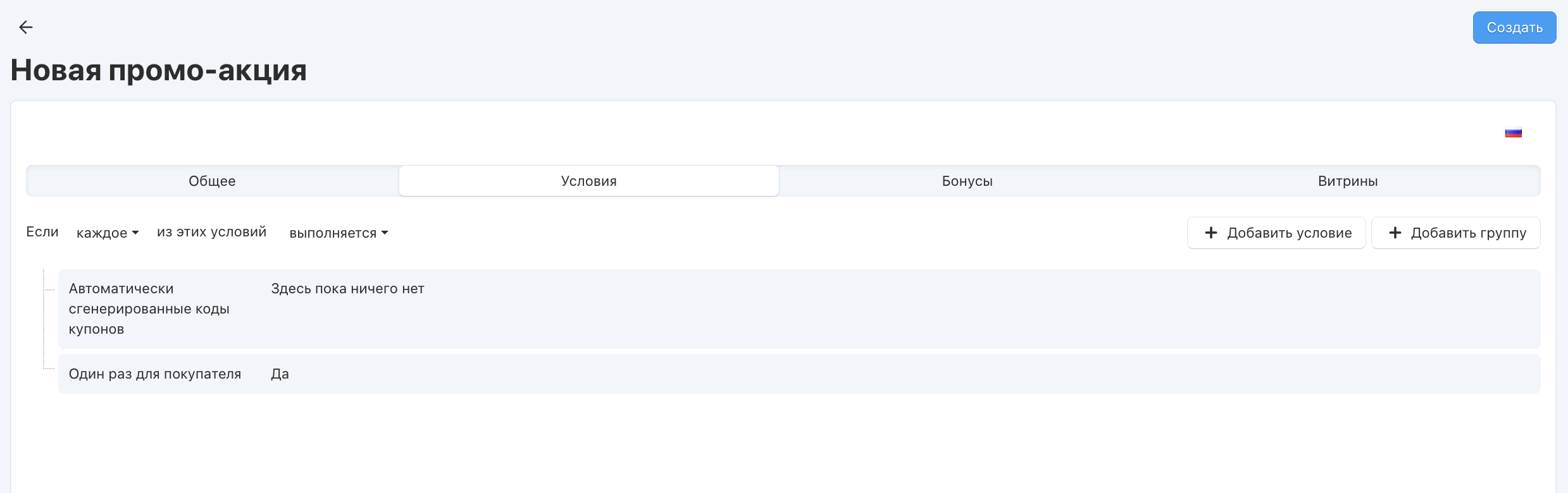Рядом с условием вы увидите надпись Здесь пока ничего нет. Это означает, что пока коды для купона не создавались. Эти коды будут создаваться промо-акцией, которую мы настроим в шаге 2.