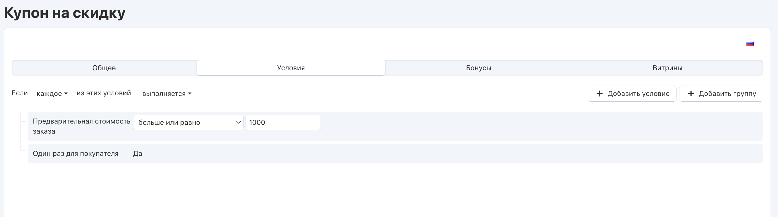 Снова нажмите Добавить условие и выберите в выпадающем списке вариант Один раз для покупателя. Так для одного покупателя будет сгенерирован только один код купона.