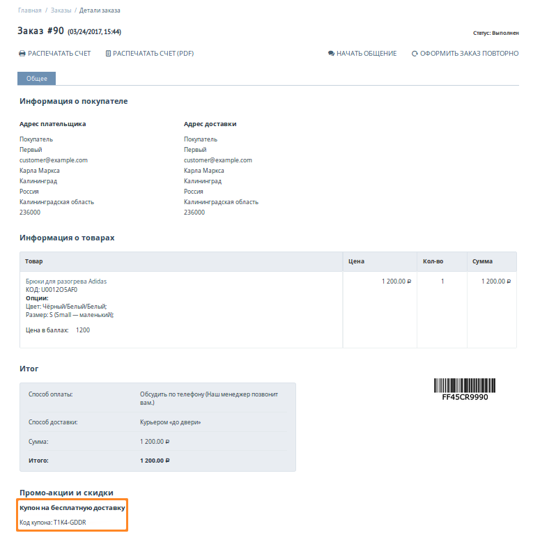 Администратор может узнать, какой код был сгенерирован для заказа. Для этого нужно открыть один из заказов на странице Заказы → Все заказы и перейти на вкладку Промо-акции. Но код сработает, только если он есть в списке кодов на вкладке Условия у промо-акции, которую мы создали в шаге 1.