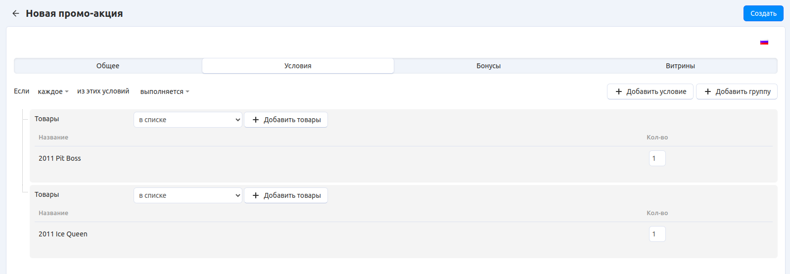 Выберите из выпадающего списка условие Товары. Затем выберите вариант в списке и нажмите кнопку Добавить товары.