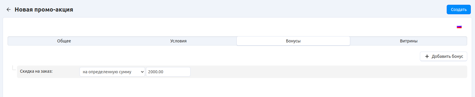 Выберите любой бонус из выпадающего списка и настройте его. Например, давайте выберем бонус Скидка на заказ с вариантом до определённой суммы и введем значение 2000. Тогда покупатель получит скидку на заказ и должен будет заплатить за все заказанные товары 2000 условных единиц в базовой валюте магазина, если только суммарная стоимость всех товаров и так не меньше 2000.