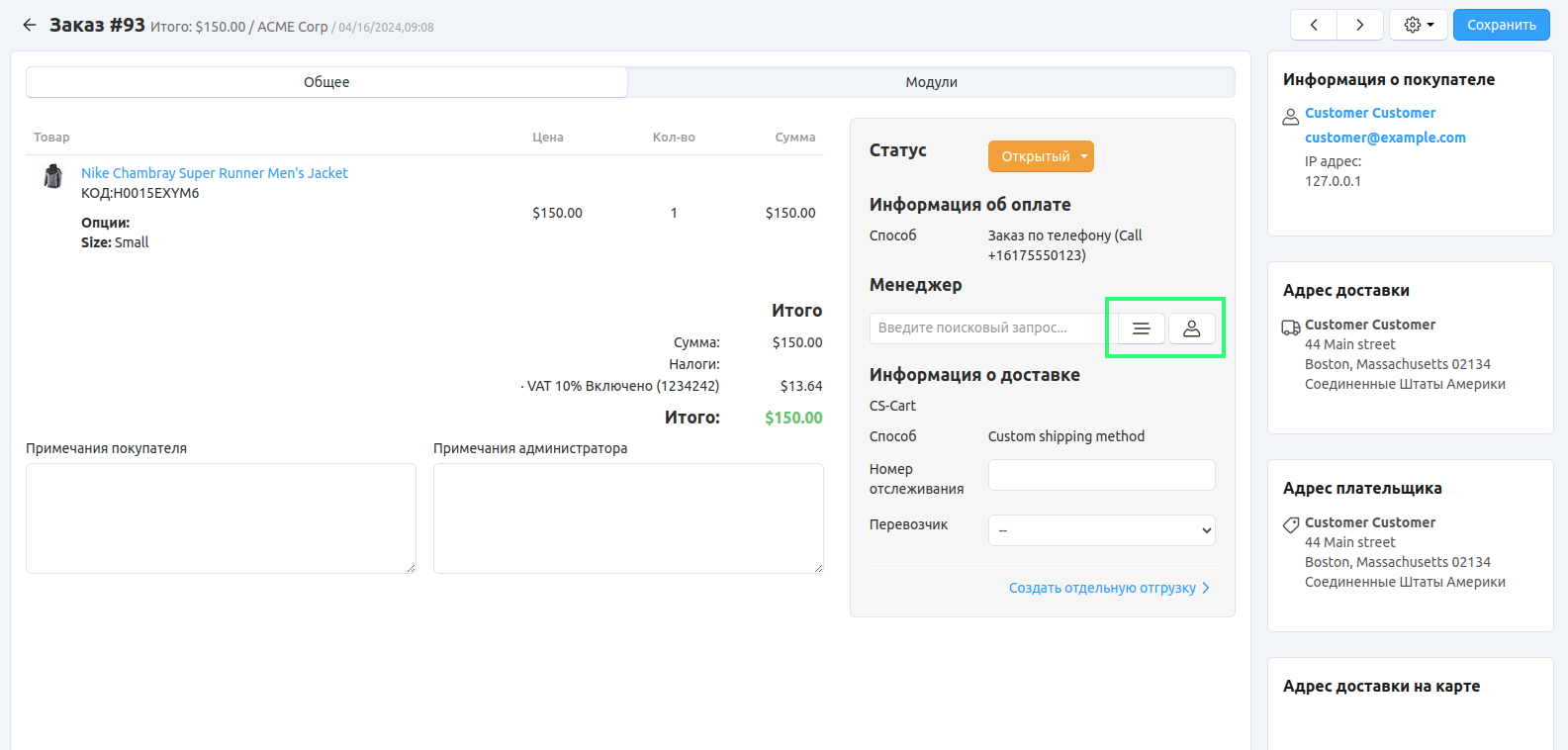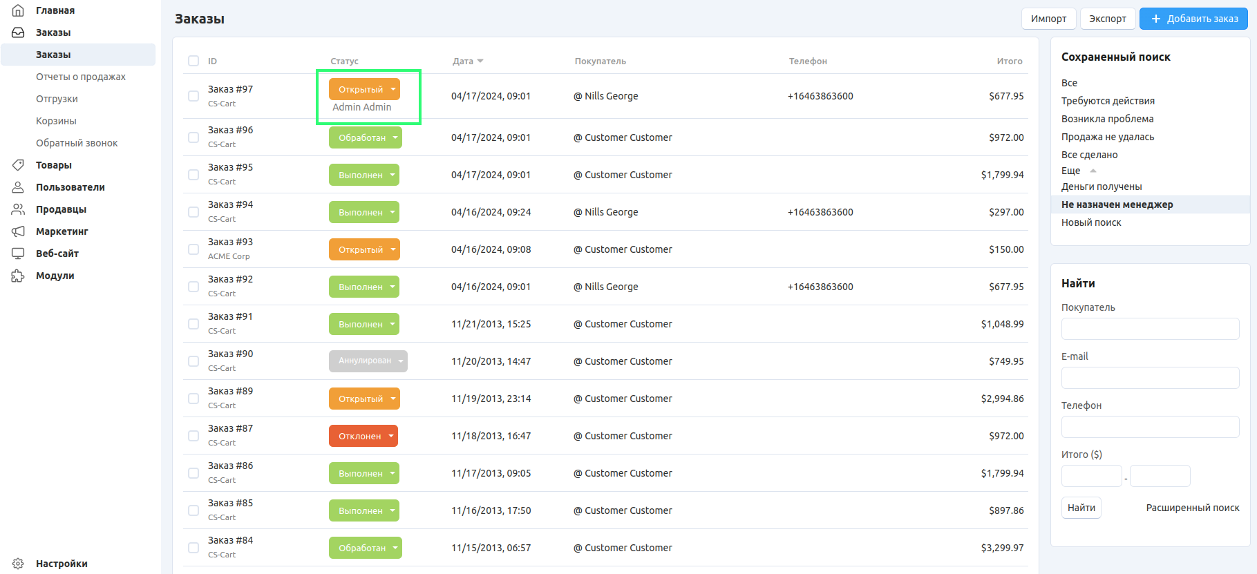 Каждому заказу можно назначить менеджера из числа администраторов магазина. Эта функциональность полезна, если у ваших сотрудников есть собственные учетные записи администраторов. Вы также можете использовать эту функциональность в отчётах о продажах для создания графиков по заказам, с которыми работают определённые менеджеры.